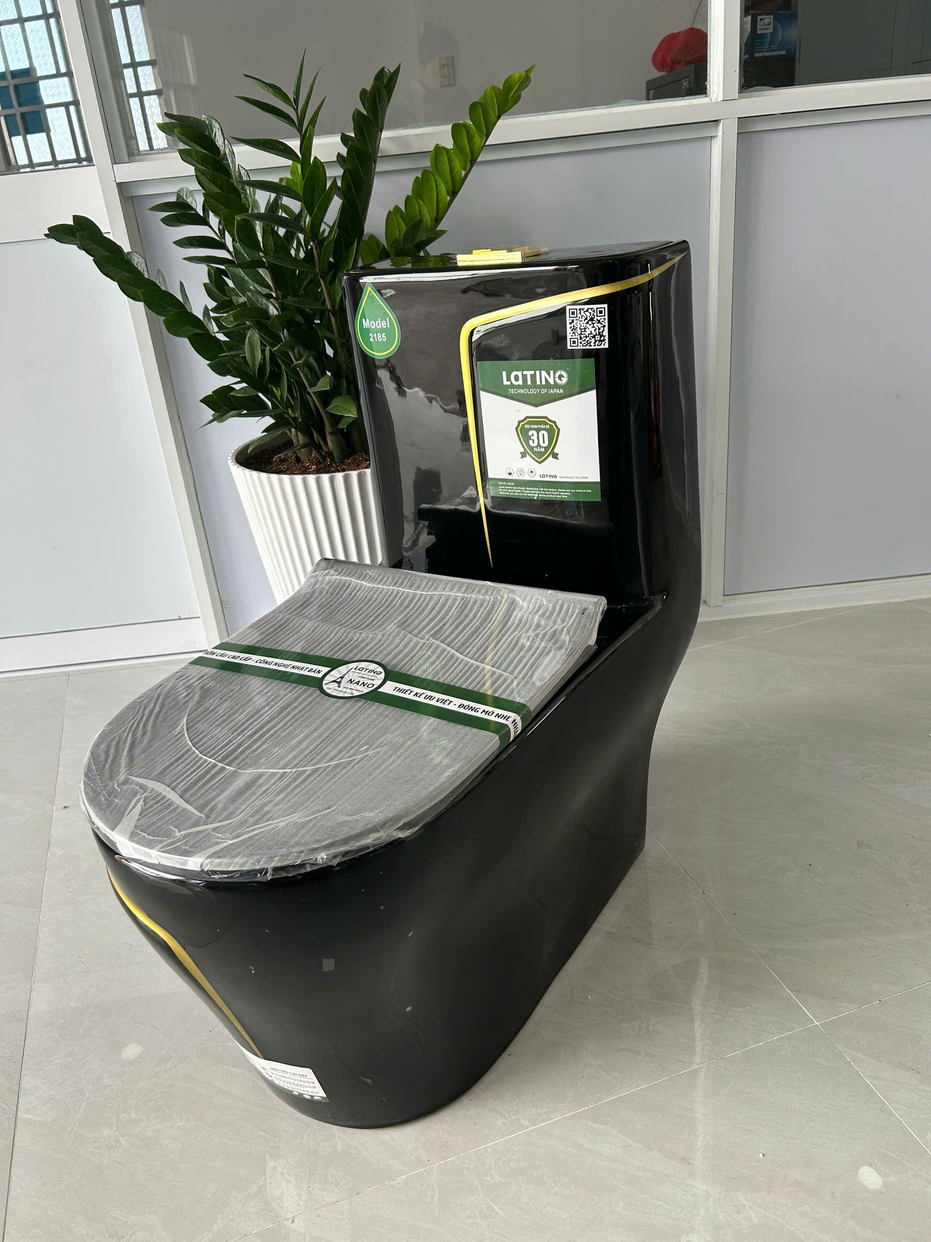Bồn cầu 1 khối Lating A2185 gây ấn tượng mạnh mẽ với thiết kế màu đen bóng sang trọng, phối cùng viền vàng tinh tế, mang đến vẻ đẹp hiện đại, thời thượng cho phòng tắm. Không chỉ nổi bật về thẩm mỹ, sản phẩm còn tích hợp nhiều công nghệ tiên tiến giúp tiết kiệm nước, vận hành êm ái và dễ dàng vệ sinh. Đây chính là sự lựa chọn lý tưởng cho những ai yêu thích phong cách nội thất cao cấp, độc đáo.